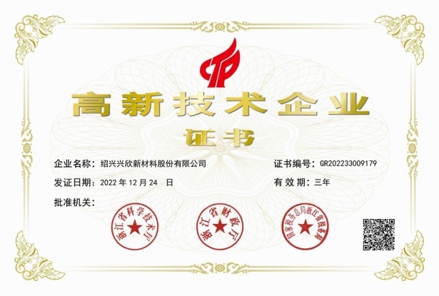 紹興興欣新材料股份有限公司成立于2002年06月27日,占地面積122畝,位于杭州灣上虞經(jīng)濟技術開發(fā)區(qū)拓展路2號,現(xiàn)有職工200余人,專業(yè)技術人員50余人;博士、碩士研究生30余人組成的一支知識型、專業(yè)化的技術科研團隊。公司面向全球市場,專業(yè)開發(fā)電子化學品、環(huán)?;瘜W品、醫(yī)藥中間體、高分子材料等先進新材料重點領域的省級科技型企業(yè);建有浙江上虞、安徽東至兩個生產(chǎn)基地。目前為“國家高新技術企業(yè)”、浙江省“隱形冠軍”企業(yè)、浙江省專精特新中小企業(yè);建有“省級”研究開發(fā)中心,共建天津大學浙江紹興研究院電子化學品研發(fā)中心。